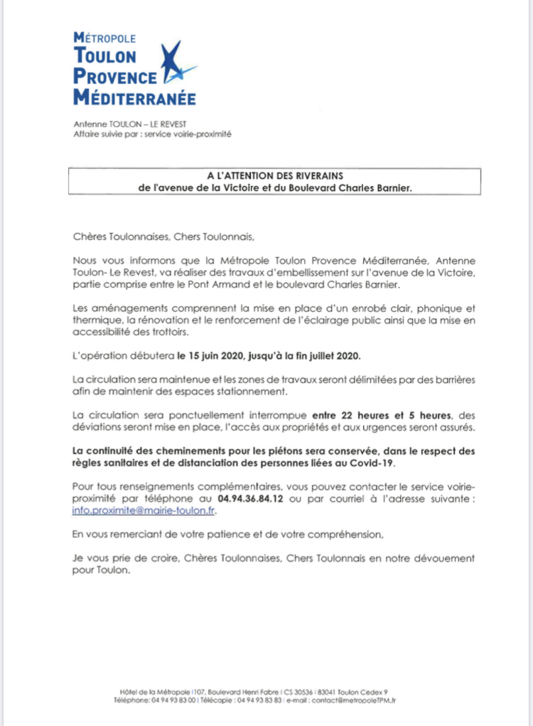 Des travaux d’embellissement sur l’Avenue de la Victoire débute le 15 juin 2020 jusqu’à la fin juillet 2020. Ces travaux ont lieu sur la partie comprise entre le Pont Louis Armand et le Boulevard Charles Barnier....