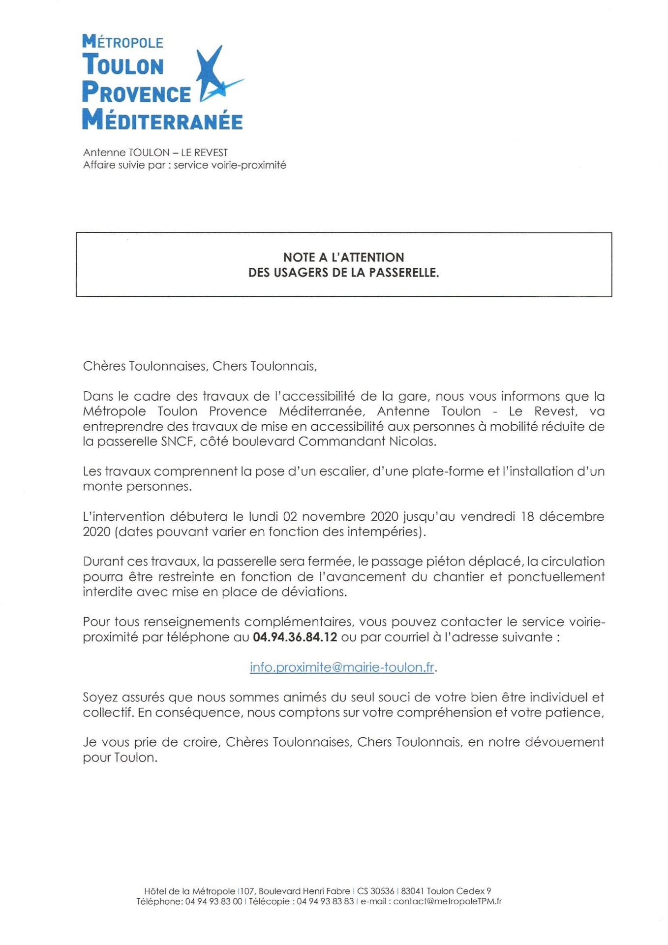 La Métropole Toulon Provence Méditerranée va entreprendre à partir du 2 novembre 2020 jusqu'au 18 décembre 2020 ( dates pouvant varier en fonction des intempéries ) les travaux de mise en accessibilité aux Personnes à Mobilité Réduite à la passerelle de la gare, côté Boulevard...