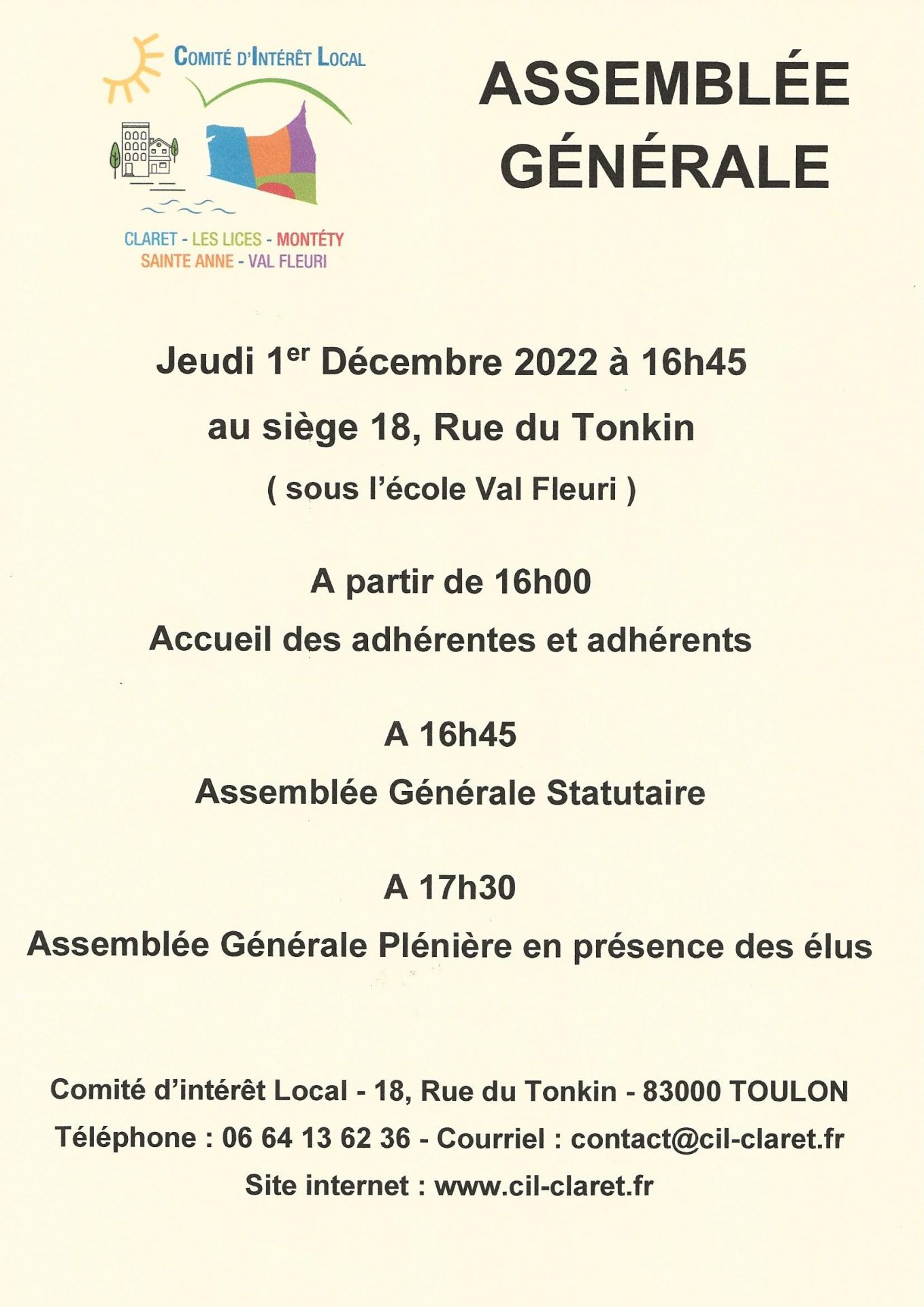 L'Assemblée Générale se déroule Jeudi 1er Décembre 2022 à 16h45 au siège 18, Rue du Tonkin ( sous l'école Val Fleuri ). Au programme : A partir de 16h00 : Accueil des adhérentes et adhérents Adhésions et/ou renouvellement des adhésions - 6,00 € pour l'année 2023. A 16h45 :...