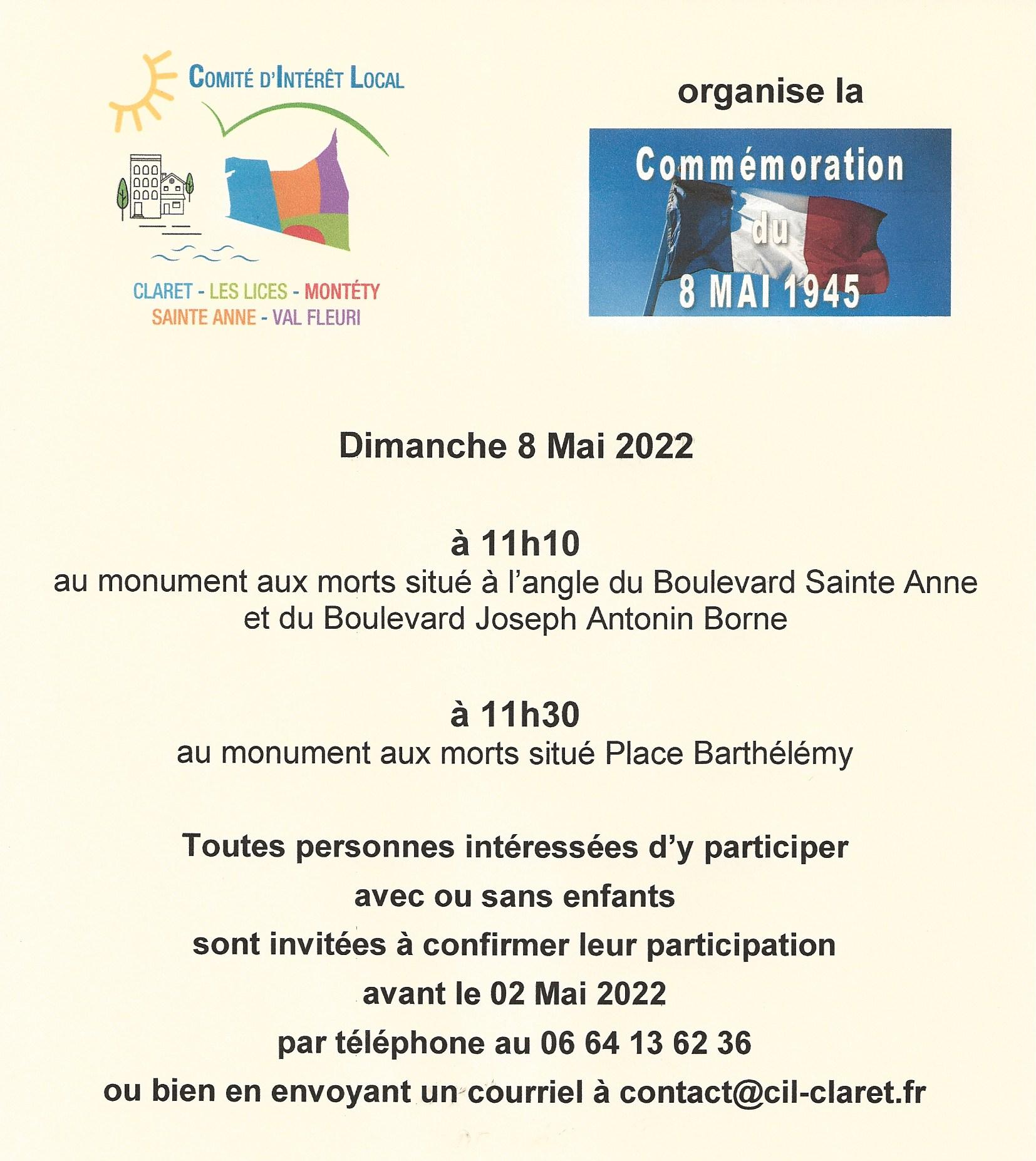 Le Comité d'Intérêt Local des quartiers de Claret, Les Lices, Montéty, Sainte Anne, Val Fleuri, organise deux cérémonies commémorant le 77ème anniversaire de la victoire du 8 mai 1945 qui se dérouleront le dimanche 8 mai à 11h10 au monument aux morts situé à l'angle...