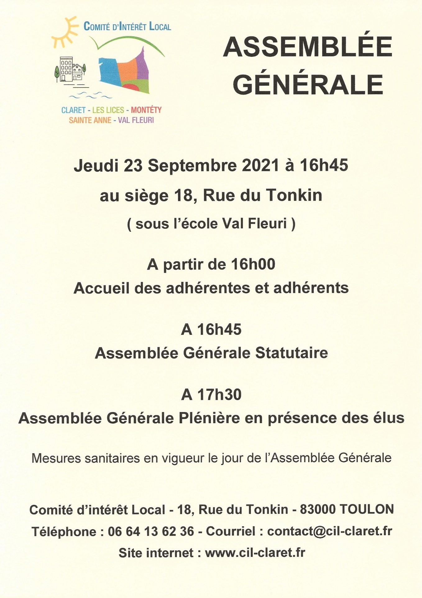 L'Assemblée Générale se déroule Jeudi 23 Septembre 2021 à 16h45 au siège 18, Rue du Tonkin ( sous l'école Val Fleuri ). Au programme : A partir de 16h00 : Accueil des adhérentes et adhérents Adhésions et/ou renouvellement des adhésions - 6,00 € pour l'année 2021. A 16h45 :...