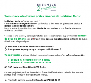 06 Nov INFO DE LA MAISON MARIS : HABITAT INTERGÉNÉRATIONNEL Posted at 11:19h in Non classé by Jean-Louis Don